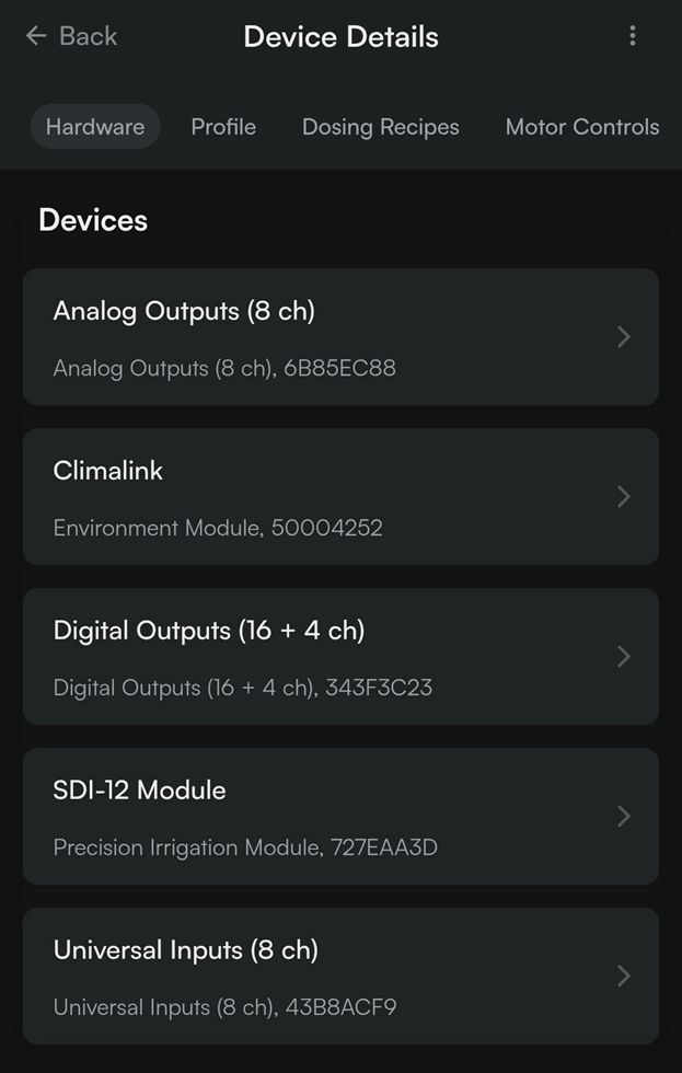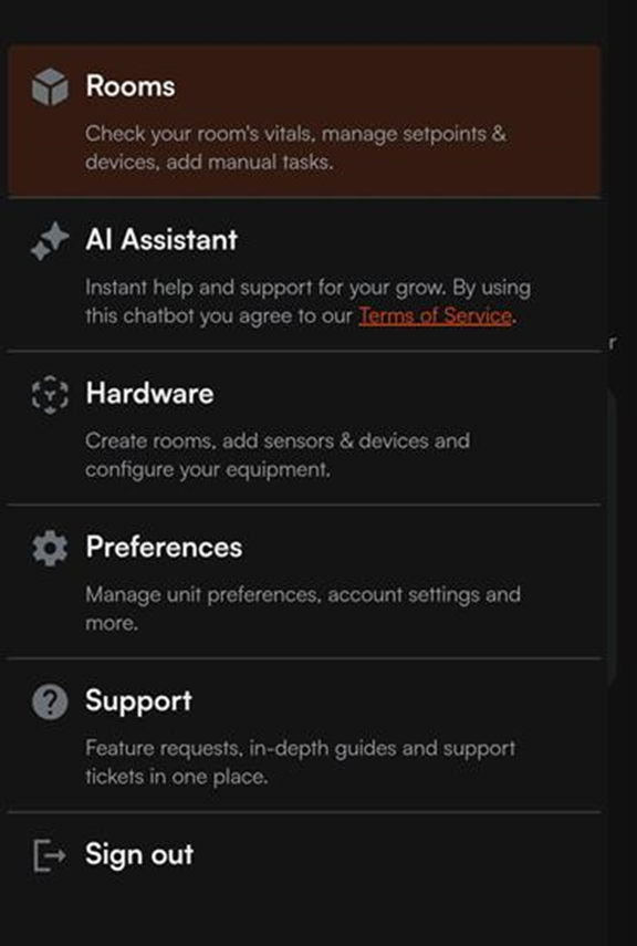 1) Start by tapping the icon of three lines at the top left of the main page of the mobile app, then select the Hardware tab:
