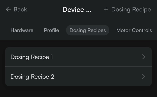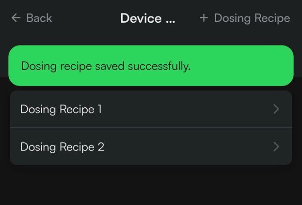 4) This page will list all configured Dosing Recipes. One can manage an existing Dosing Recipe by tapping the recipe name, or tap the ‘+ Dosing Recipe’ button at the top right to create a new Dosing Recipe: