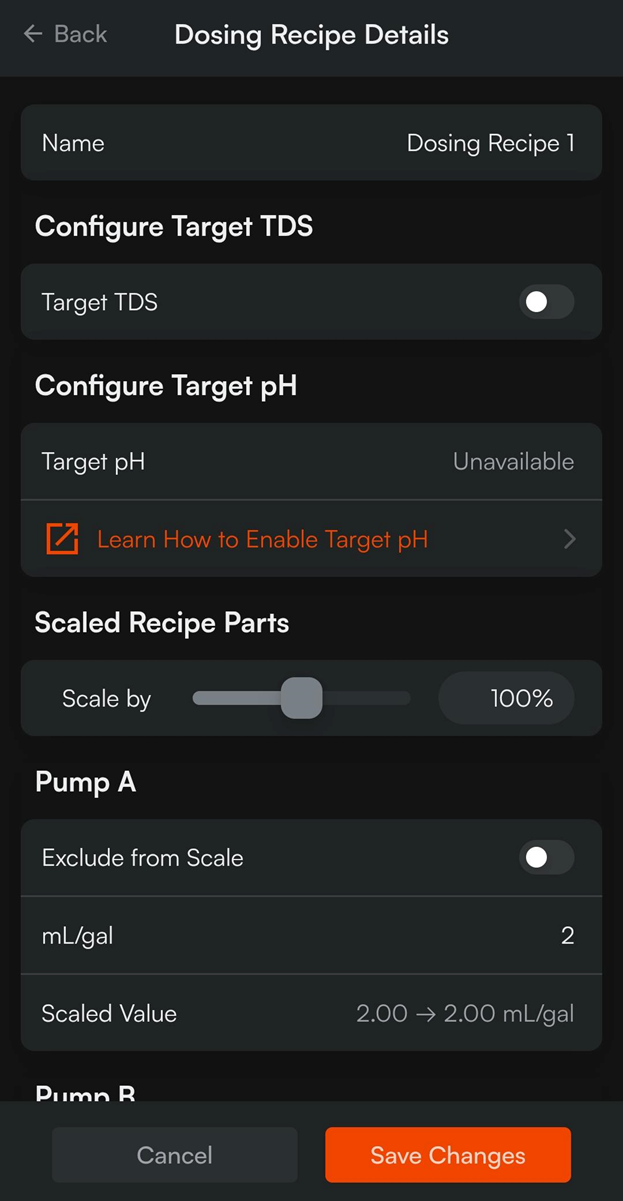 5) Within the Dosing Recipe, one can name the Dosing recipe, enable target pH or target TDS (if applicable), set the scaling ratio for the dosing recipe, and specify the injection volumes for each pump used in that Dosing Recipe: