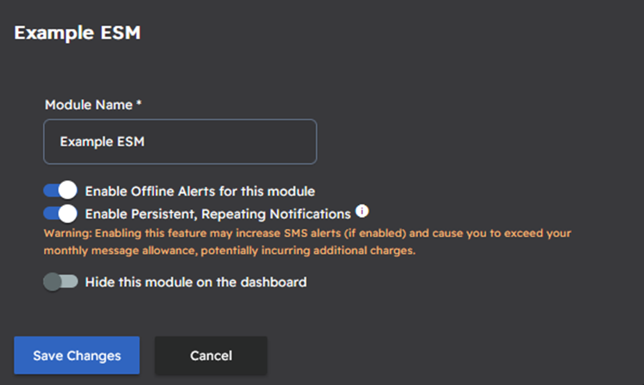 - Users have an additional toggle on all module edits in the Hardware>Controllers>Module edit panel to indicate whether the offline alert has repeated notifications or not: