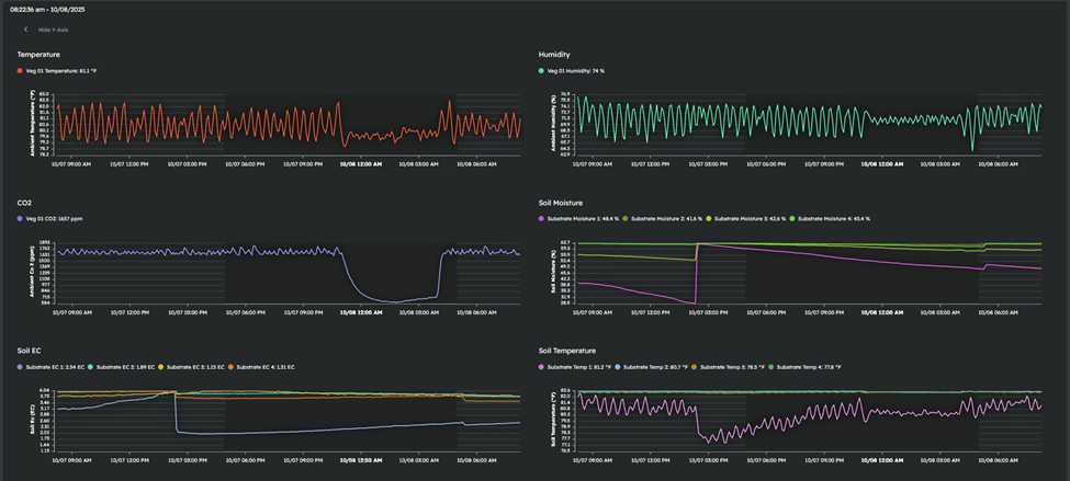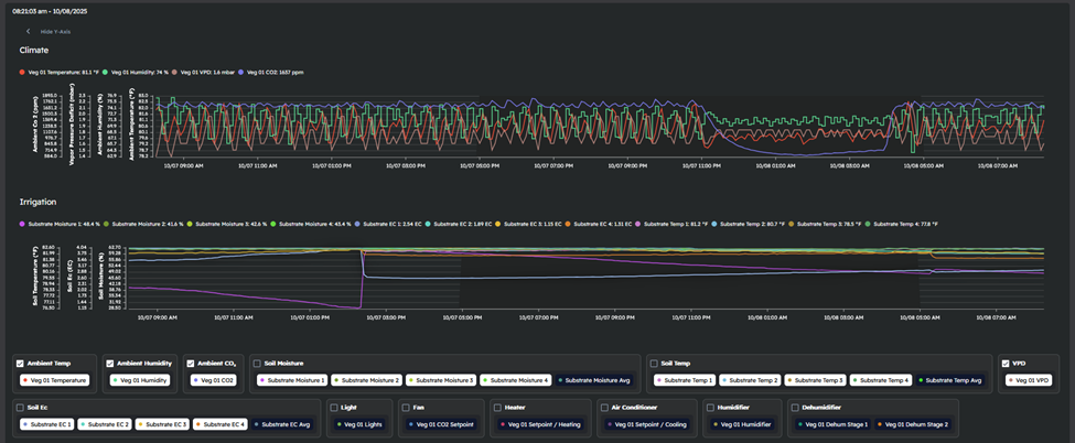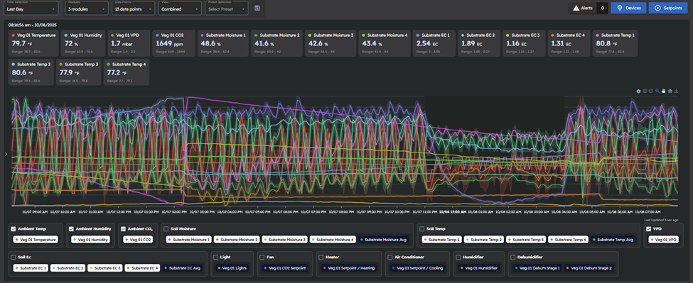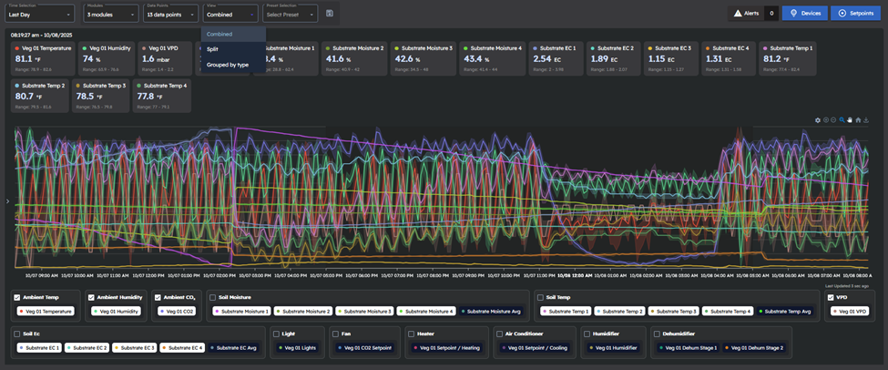 Within the Web Portal’s dashboard, one can view sensor and device data for registered sensors and devices to a controller. The default view is the Combined view, where one can overlay sensor and device data together: