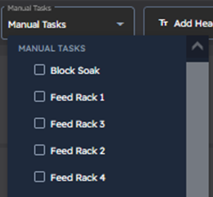 To add Manual tasks, click the Manual Tasks drop down, select the desired manual tasks to display in the dashboard, then hit the ‘Add’ button in the top of the page.