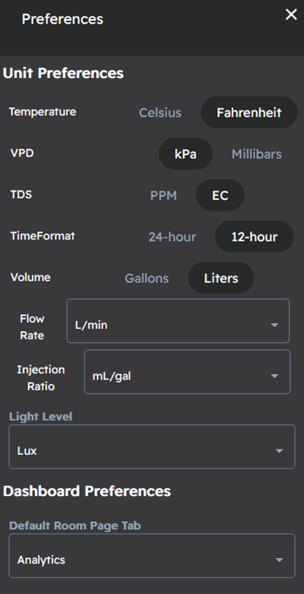 Lastly, in the Preferences tab within Portal 2.0, one can specify if clicking on a room card defaults to this new custom dashboard tab, or defaults to the old dashboard for viewing historical data (now named the Analytics Tab):