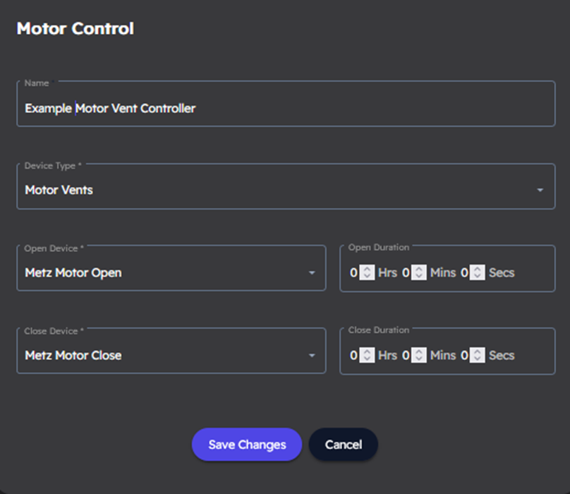 There are additional optional duration settings one can set for both the open and close signals. This can be helpful if you know how long it takes for the motor controller, vent, or shade curtain takes to fully open or close, which will then fire that output for the specified duration when triggered. Keeping the duration set at 0hrs 0mins 0s results in the open or close signal being called indefinitely when triggered: