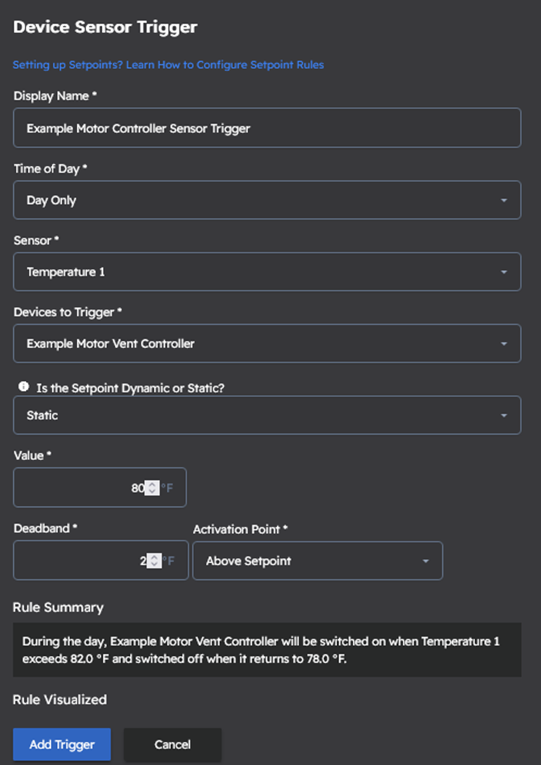 The rule configured above will trigger the Open signal to turn on if the temperature in the space exceeds 82°F, and trigger the Close signal to turn on when the temperature is at or below 78°F.