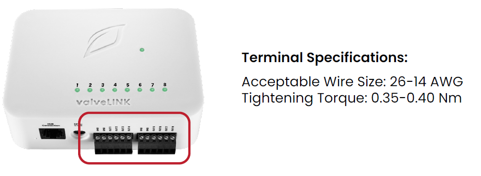 Eight (8) terminals are provided for controlling 24VAC valves via a 50% PWM 24VDC signal.
