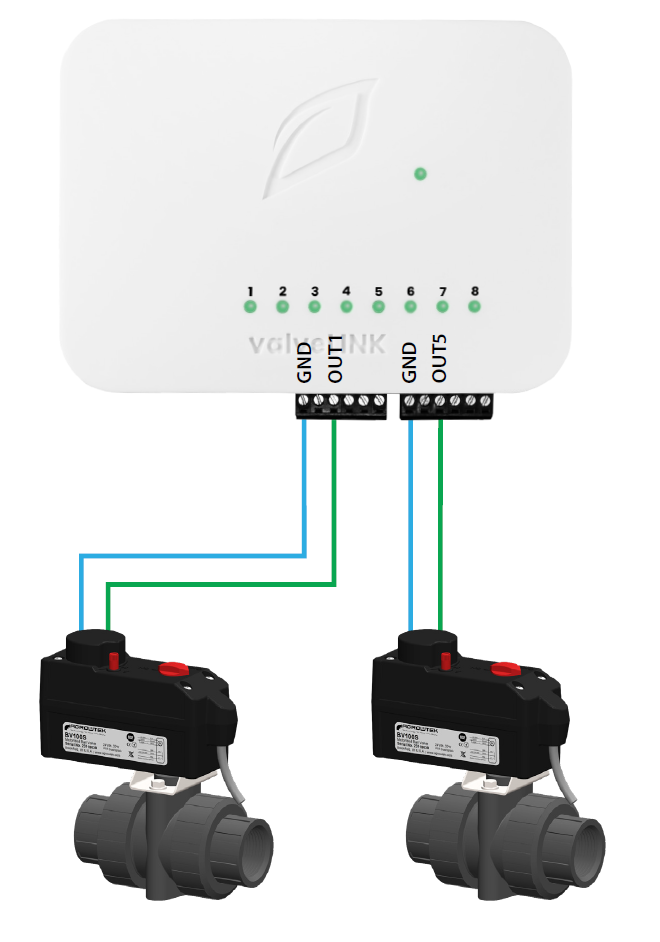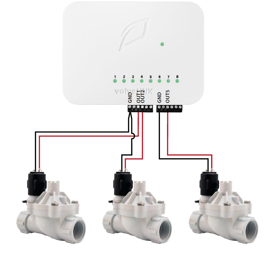 Standard 24VAC irrigation valves can be connected directly to the valveLINK outputs. Up to eight valves can be connected and up to four valves can be operated simultaneously.